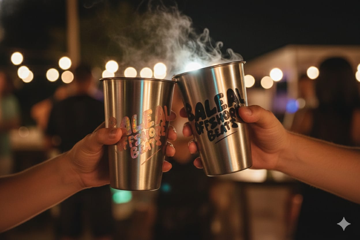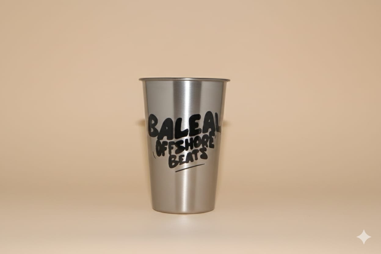 Copo em inox de 500ml com o logo oficial do Baleal Offshore Beats. Resistente, reutilizável e perfeito para acompanhar o festival.